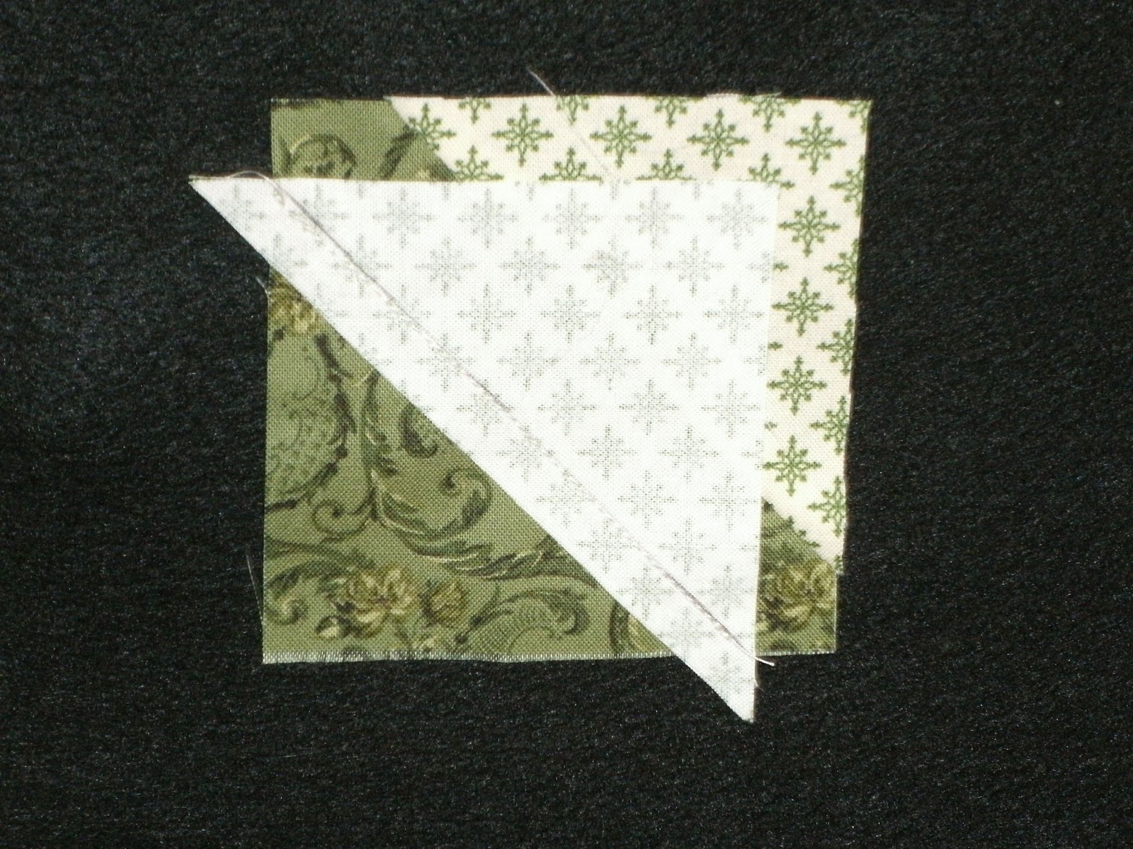 9 Lt. Green 1 1/4" x 1 1/4" squares in 3 of the corners of the Dk. Green squares. Sew diagonally and trim to a 1/4" seam allowance..